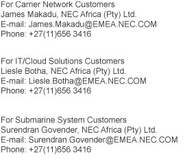 NEC is a leading global provider of innovative and integrated IT and networking solutions, delivering a complete portfolio of mobile and broadband networking infrastructure, innovative cloud platforms and proven applications that meet the complex and changing needs of our customers. NEC's IT and networking solutions enables carriers to seize the opportunities of the emerging cloud era, without delay, with minimum investment, and with carrier grade security and quality. We have the key to a business transformation that builds a continuous stream of new revenue.