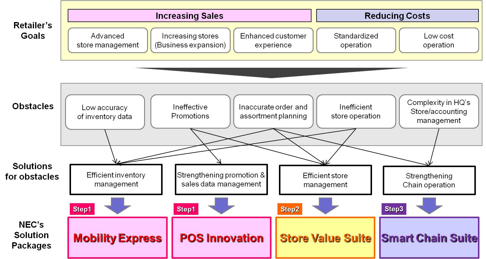 Retailers are seeking an increase in sales and cost reduction. Especially for increase in sales, it is important to build strategies for store management sophistication, store expansion, customer relations enhancement, and so on. On the other hand, cost-cut along with continuous efforts for operation standardization are necessary to reduce costs.