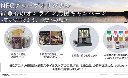 Through this campaign, NEC Group employees across Japan supported Noto by enjoying and experiencing locally produced foods and products. More than 100 NEC Group employees nationwide participated in the campaign, sharing not only their support through purchases, but also sending many heartfelt messages of encouragement to the people of Noto.