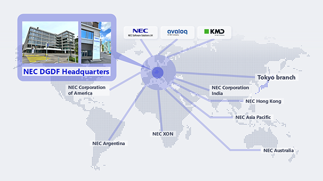 The DGDF Business Unit's predecessor was responsible for the global expansion of national ID and other projects leveraging NEC's biometric authentication technology. Between 2018 and 2020, NEC acquired several European companies to expand its global business into more stable and sustainable domains. The three companies it acquired were NEC Software Solutions UK, a company providing software and services to government agencies, municipalities, the police, hospitals, and other entities in the UK; KMD, the largest IT company in Denmark and one that has driven the digitalization of the Danish government; and Avaloq, Switzerland's leading financial software company.
