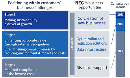 In the Environmental Strategy section, we outlined NEC’s approach and goals in addressing environmental management challenges, and we recognize that our customers face similar issues. NEC is still in the process of advancing its environmental management, and we believe customers are also at varying stages: Stage 1, where they are responding with minimal cost to meet customer demands and regulatory requirements; Stage 2, where they aim to reduce environmental impact and improve competitiveness while earning external recognition and enhancing corporate value amid rising carbon taxes and energy costs; and Stage 3, where environmental initiatives are integrated into their growth strategies, going beyond cost savings and value enhancement. NEC believes it can contribute in various ways tailored to each customer’s stage, drawing on its own experience.