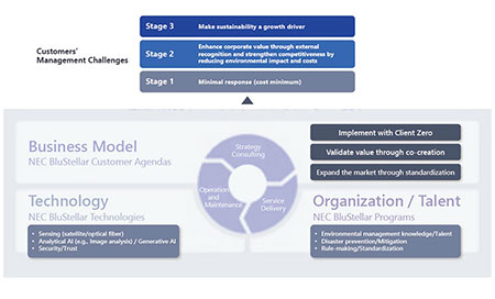In 2024, NEC introduced BluStellar, an end-to-end business model that creates value starting from customers’ management challenges. NEC applies the BluStellar values creation model in its environmental business as well. By leveraging technologies such as sensing, AI, and security, along with highly regarded external experts and knowledge, we visualize and analyze complex environmental issues to clarify the challenges that need to be addressed. Through the Client Zero approach, which treats NEC itself as the first client for value verification, and co-creation with clients, we clarify issues and effects, contributing to the establishment of industry standards.