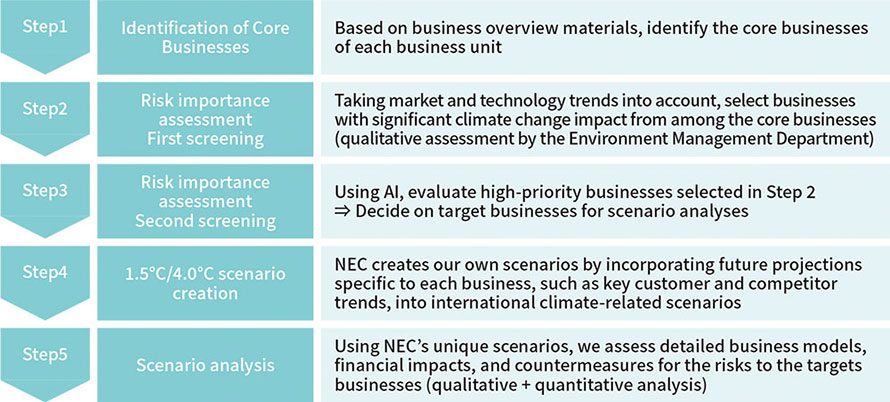 In fiscal year 2025, NEC conducted a scenario analysis-based risk assessment across all its businesses. By applying AI for the first time and screening by the Environment Management Department, NEC identified companywide and business-specific climate-related risks that could reasonably be expected to impact the Company’s outlook. The Environment Management Department led the assessment, and confirmed that NEC could continue and grow its business under any scenario by taking appropriate measures. The climate change risk measures identified will be sequentially incorporated into the long-term strategies of each business unit.