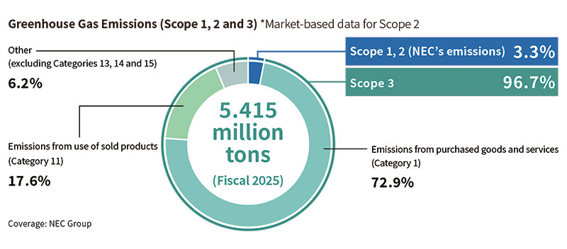 The NEC Group has the goal of achieving carbon neutrality by 2040, which has been certified as a Net-Zero goal by SBTi. To achieve this goal, we aim to reduce Scope 1, Scope 2 and Scope 3 emissions by more than 50% each by fiscal year 2031 compared to fiscal year 2021. To achieve our goals, for Scope 2 we are increasing the use of renewable energy that meets the RE100 standard. For Scope 3, we are engaging with our suppliers to reduce Category 1 emissions, which is the category with the highest emission volume.