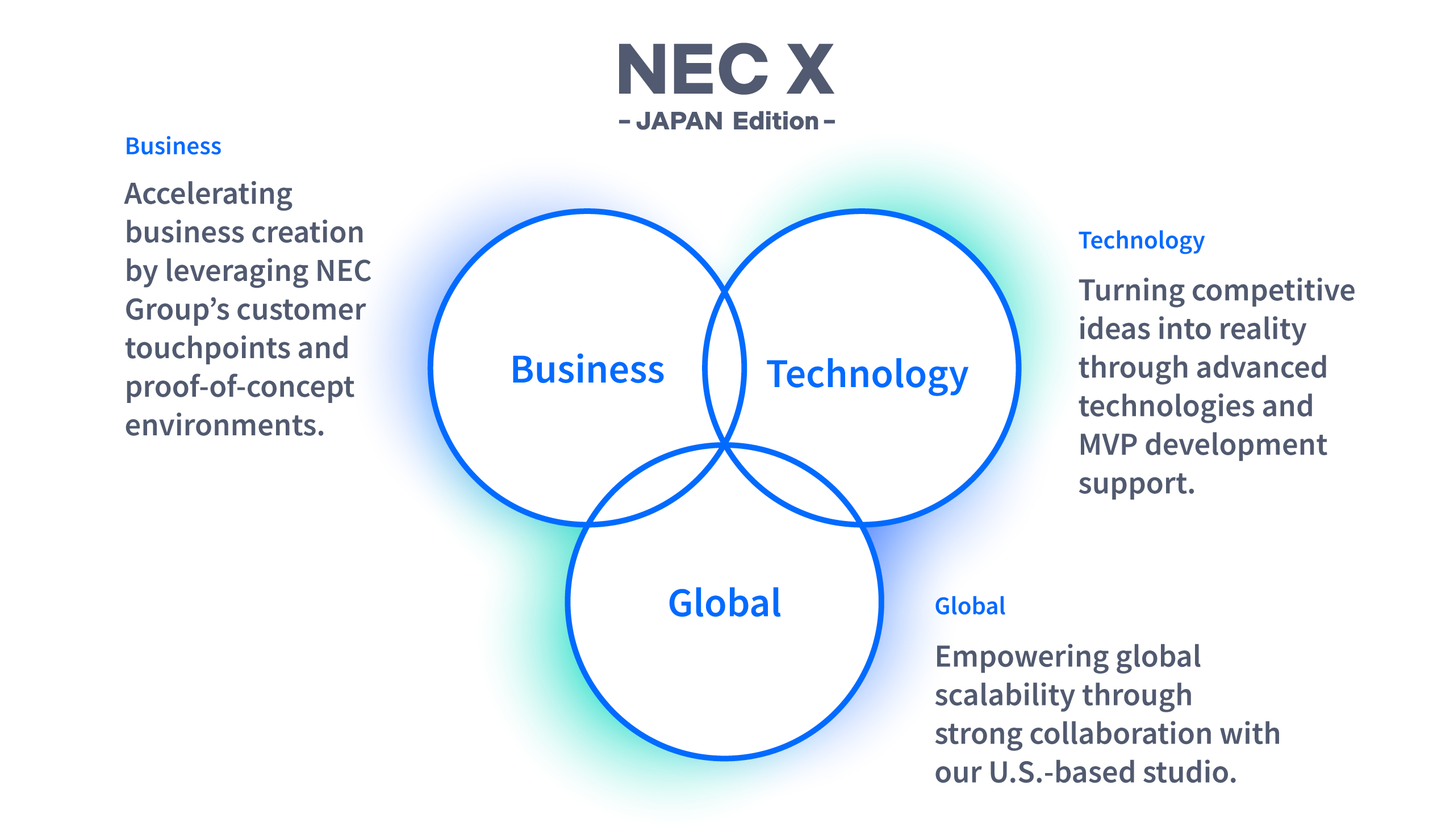 NEC X - JAPAN Edition - is a startup studio that leverages NEC's assets to the fullest to co-create disruptive business ventures with entrepreneurs.