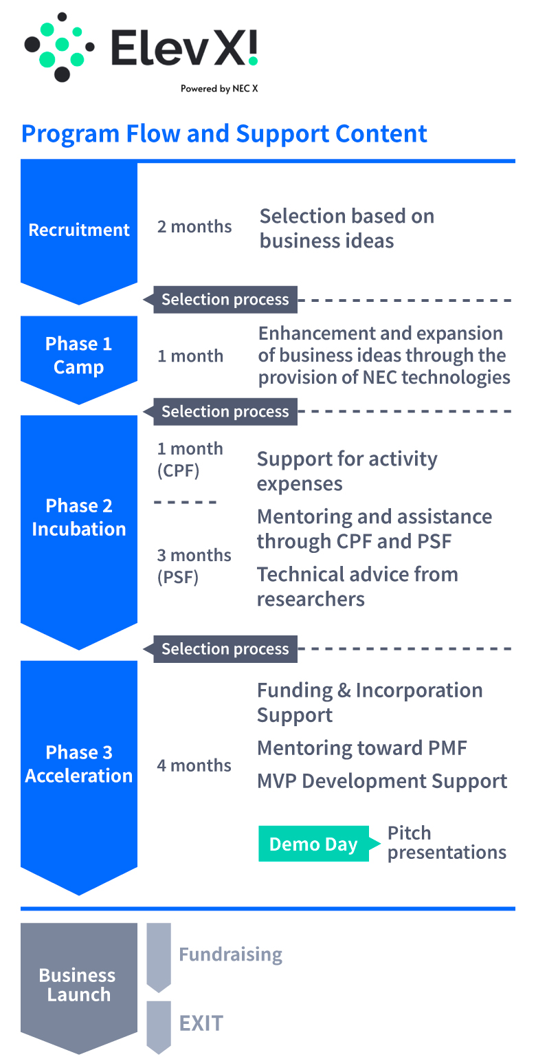 Elev X! is a proven acceleration program based on the expertise and network cultivated by NEC X in Silicon Valley. Operated in a biannual batch format, the program provides hands-on support to entrepreneurs.