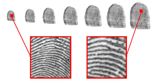 Although the stripe patterns of the dermal ridges on the fingerprints does not change, the space between them does as the fingertips become larger. We developed a technology that would automatically detect the size of the gaps between the ridges and adjust for this so that the fingerprints could be read correctly even if the ridges grew further apart.