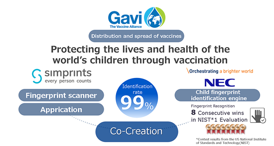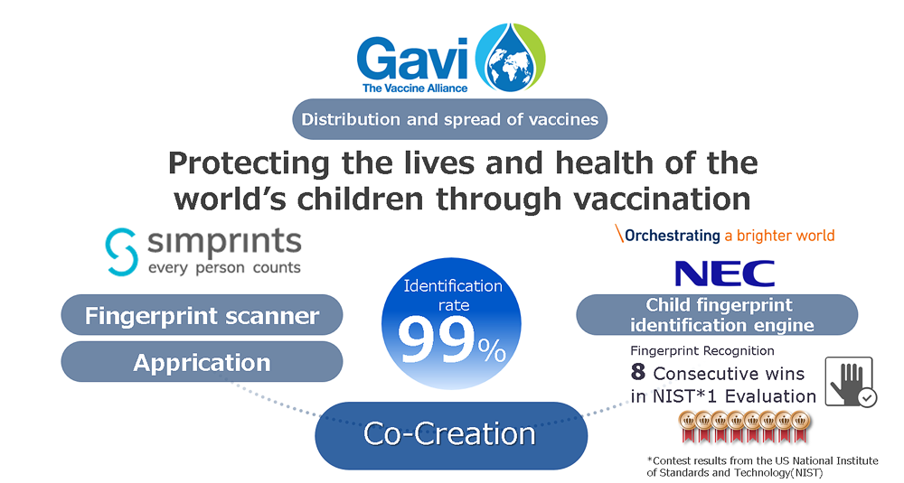 Larger viewNEC's 99% accuracy in child fingerprint identification engine has been combined with Simprints' fingerprint identification solution. Gavi is using this system to spread vaccinations throughout developing countries. This gives many children the opportunity to receive vaccinations that they would have not had before