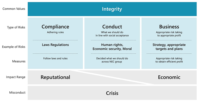 The NEC Group refers to the Enterprise Risk Management - Integrated Framework of the Committee of Sponsoring Organizations of the Treadway Commission (COSO), and ISO31000 which is an international standard that provides principals and guidelines for risk management. On this basis, the NEC Group, in order to pursue returns through appropriate risk management, has categorized the risks associated with the NEC Group’s businesses into the Risk Total Picture and has decided on responsible divisions and response policies for each risk. In the Risk Total Picture, integrity is recognized as the foundation of all risk management activities and risks are classified into three categories according to their nature. The Company has developed a response flow in case such risk should materialize, especially in the event of a crisis that threatens the existence of the Company.