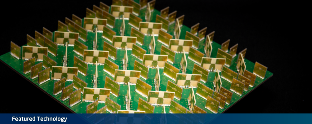 Addition of heat dissipation function to antennas, which conventionally do not have this function On the surface of a massive-element antenna that incorporates the new technology, the antenna elements function as heat dissipation fins, and many additional metal plates that function as heat dissipation fins are arranged between and around the antenna elements, thereby improving the heat dissipation effect (Figure 2). Figure 2: Massive-element antenna array The heat dissipation effect of the antenna is improved by expanding the metallic surface area of the antenna elements, which increases the share of the total area that is composed of metal. Furthermore, the additional metal plates employ a frequency-selective surface (FSS) structure, making them electromagnetically transparent to specific radio wave frequencies. This allows specific radio wave frequencies to pass through the plates without any reflection, even though the plates consist of metal. As a result, the addition of heat dissipation fins increases the efficiency of heat dissipation without disrupting the radio waves of the antenna. This antenna technology makes it possible to dissipate heat from both the antenna and the heat sink, while maintaining the radio emission properties (Figure 3). Without heat dissipation fins (antenna element only)Heat dissipation fins: Without FSS structure