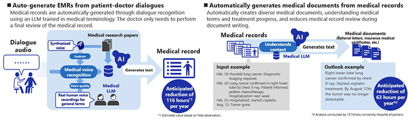 This time, NEC developed an original medical language processing technology, which offers two functions: "electronic medical record documentation assistance" and "medical documentation assistance." Both aim to improve operational efficiency for physicians working long hours. We believe that they will be a solution for complying with the new system under the working style reformation that comes into effect in April 2024.
