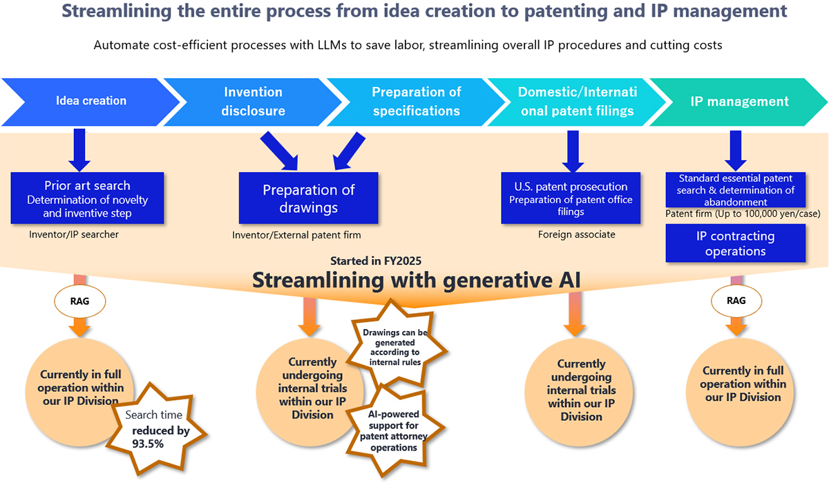 NEC has been promoting IP DX operations to streamline IP tasks using generative AI. Internal trials have been conducted by our IP Division. While IP digital transformation is an area that various enterprises and other organizations are working on, NEC’s IP DX is characterized by its extensive coverage of operations, including prior art search, preparation of drawings to be attached to specifications, generating documents to be submitted for filing a patent with the U.S. Patent Office, and IP contracting operations. The IP DX initiative has been proven to be greatly effective; for example, when the NEC IP Division used AI-based prior art search, it was able to reduce search time by 93.5% in accordance with the best practice.