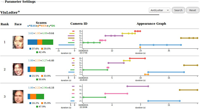 By changing the weights according to your purpose, you can set the priority so that the individuals with the target appearance pattern come up in higher ranks. For example, if you want to find people passing through, you can increase the weight on "movement." To find people stopping, you can increase the weight on "stay duration." To find people wandering, you can increase the weight on both "movement" and "stay duration." In this way, target individuals can be extracted by appearance patterns.