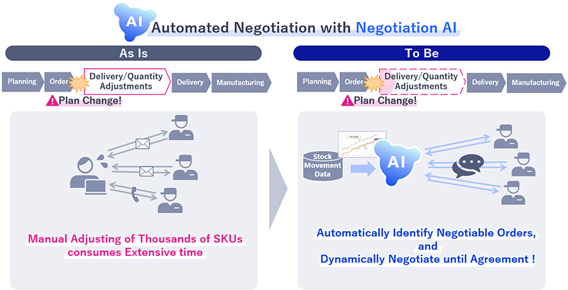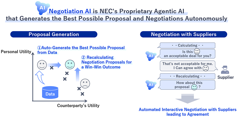 Procurement Negotiation AI Agent leverages NEC’s proprietary Agentic AI, an automated negotiation AI. It automatically derives non-negotiable conditions and desirable outcomes, then proposes favorable terms that are likely acceptable to the counterpart. This AI is designed not only for human-AI negotiations but also for AI-to-AI interactions.
