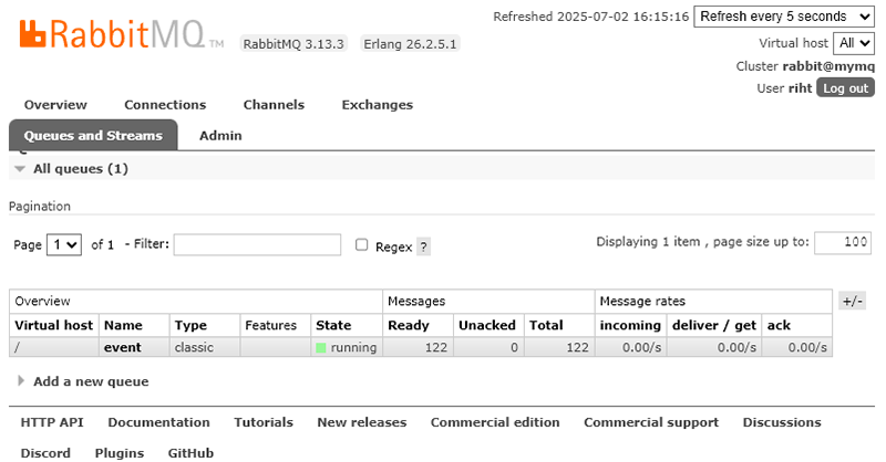 # -e RABBITMQ_DEFAULT_USER=riht: Set the administrator username to “riht”. Change it as needed.