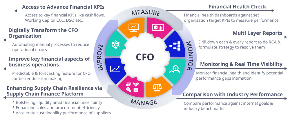 CFOs face new challenges every day, including growing geopolitical risks, managing working capital and liquidity, and meeting rising ESG expectations, to name a few. Our solution leverages advanced analytics and AI/ML technologies—such as generative AI and agentic AI—to help CFOs navigate these complexities with greater confidence. It provides capabilities to measure, monitor, predict, and forecast business performance KPIs. Additionally, it supports the management and improvement of working capital, liquidity, and supply chain resilience through the adoption of supply chain financing solutions.
