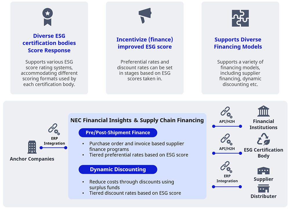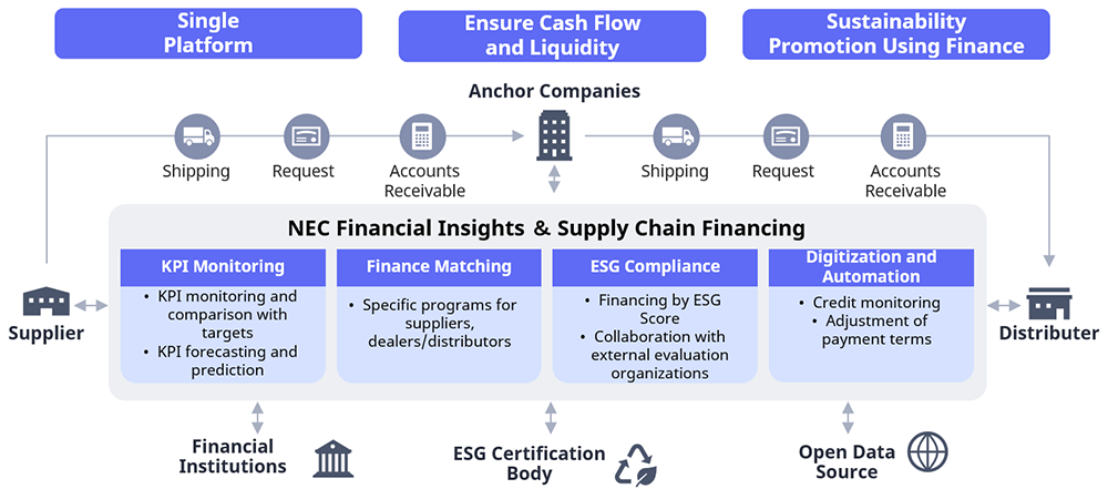 NEC Financial Insights and Supply Chain Financing solution aims to digitally transform companies' traditional ways of managing financial data. It empowers CFOs and their teams to view and manage end-to-end financial data on a single platform, enabling informed decision-making. It provides real-time visibility into data, helping organizations measure and monitor working capital performance against KPIs and industry benchmarks. The solution helps connects enterprises with supply chain partner ecosystems, financial institutions to improve working capital and liquidity, achieve supply chain resilience, minimize supply chain risks and achieve ESG adherence
