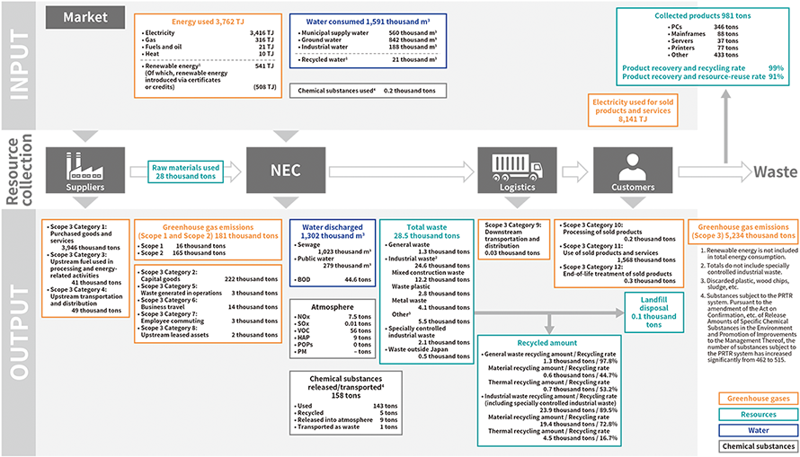Environmental data for plants and offices worldwide are compiled using NEC’s proprietary environmental performance management solution, GreenGlobeX.