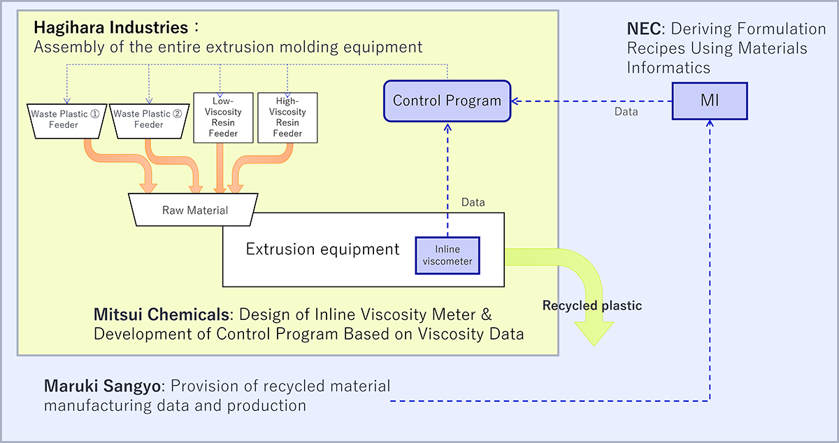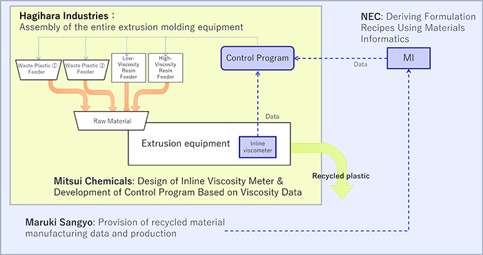 In this collaboration, an extruder utilizing technology developed by Mitsui Chemicals and Hagiwara Industries—which Hagiwara Industries began manufacturing and sales of this October—will be employed. This technology measures viscosity during recycled plastic production and adjusts additive input to achieve uniformity (*2). Viscosity data obtained at Maruki Sangyos' factory will be analyzed using NEC's MI technology. This enables real-time adjustment of all materials required for recycled plastic production while measuring viscosity, thereby achieving stable quality. Furthermore, it eliminates the tumbling process, which is typically necessary for quality stabilization in companies manufacturing and using recycled plastic, aiming to reduce overall production time by 25% compared to conventional methods.