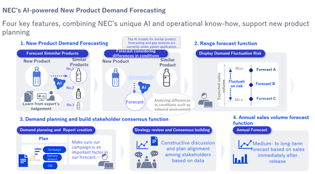 In traditional new product development, insufficient historical data made it difficult to create accurate forecasts. NEC’s AI-powered New Product Demand Forecasting Solution leverages proprietary AI to predict and support stakeholder consensus-building.