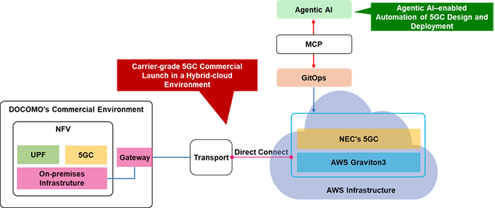 In a separate world-first achievement3, DOCOMO and NTT DOCOMO BUSINESS, Inc. in collaboration with NTT DOCOMO SOLUTIONS, Inc. have also successfully automated 5GC design and construction on AWS. To do this, they leveraged Agentic AI—a combination of AI and GitOps4 in a hybrid cloud environment. This innovative approach prevents human error and reduces construction time by approximately 80% compared to conventional methods.