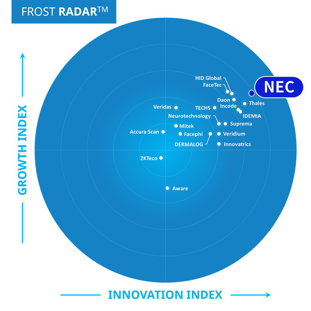 NEC was recognized as a "Market Leader" in the "Frost Radar™: Biometric Solutions, 2025" report published by global research firm Frost & Sullivan, marking the third consecutive time, following the previous survey in 2022. In this market survey, Frost & Sullivan assessed NEC’s leadership in the Frost Radar™ Innovation Index as a result of continuous innovation across NEC’s broad biometric business portfolio.