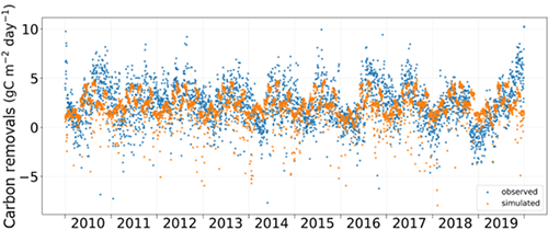 NEC’s data assimilation technology (patent pending) was used to correct data errors, and observed data was compared with simulated data in order to calculate carbon accumulation rates with a high degree of accuracy, achieving a daily margin of error of 9.4%.